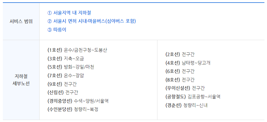 - 이용범위: 서울 지역 지하철, 서울시 면허 시내,마을버스, 따릉이